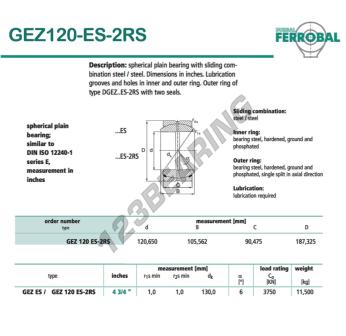 Das Gelenklager Geew bekannt als DGEZ120-ES-2RS-DURBAL DURBAL hat einen Innendurchmesser von 120.65 mm, einen Außendurchmesser von 187.325 mm und einer Dicke von 90.475 mm.