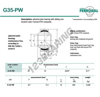 Das Gelenklager Geew bekannt als G35-PW-DURBAL DURBAL hat einen Innendurchmesser von 35 mm, einen Außendurchmesser von 62 mm und einer Dicke von 28 mm.