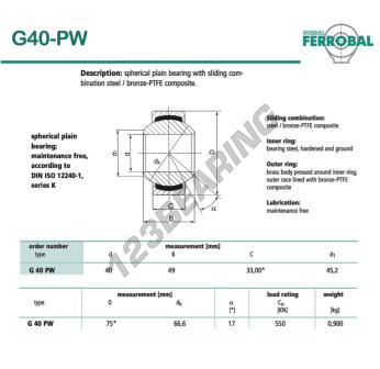 Das Gelenklager Geew bekannt als G40-PW-DURBAL DURBAL hat einen Innendurchmesser von 40 mm, einen Außendurchmesser von 75 mm und einer Dicke von 33 mm.