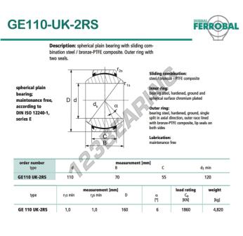 Das Gelenklager Geew bekannt als GE110-UK-2RS-DURBAL DURBAL hat einen Innendurchmesser von 110 mm, einen Außendurchmesser von 160 mm und einer Dicke von 55 mm.