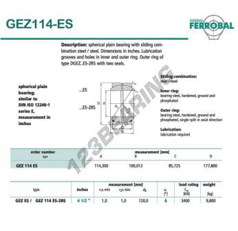 Das Gelenklager Geew bekannt als GEZ114-ES-DURBAL DURBAL hat einen Innendurchmesser von 114.3 mm, einen Außendurchmesser von 177.8 mm und einer Dicke von 85.725 mm.