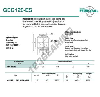 Das Gelenklager Geg bekannt als GEG120-ES-DURBAL DURBAL hat einen Innendurchmesser von 120 mm, einen Außendurchmesser von 210 mm und einer Dicke von 70 mm.