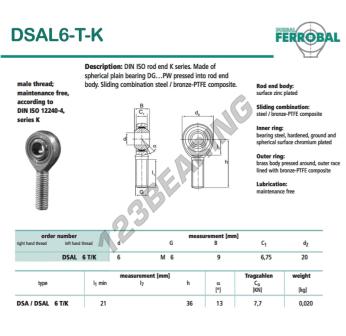 Die Gelenkkopf Sa bekannt als DSAL6-T-K-DURBAL DURBAL, hat eine Gewindesteigung von , einen Innendurchmesser von 6 mm, einen Außendurchmesser von 20 mm und eine Dicke von 9 mm.