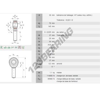 Die Gelenkkopf Sa bekannt als GAKR30PW-INA INA, hat eine Gewindesteigung von , einen Innendurchmesser von 30 mm, einen Außendurchmesser von 145 mm und eine Dicke von 37 mm.