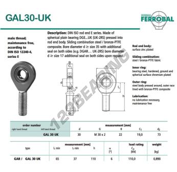 Die Gelenkkopf Sa bekannt als GAL30-UK-DURBAL DURBAL, hat eine Gewindesteigung von , einen Innendurchmesser von 30 mm, einen Außendurchmesser von 73 mm und eine Dicke von 22 mm.
