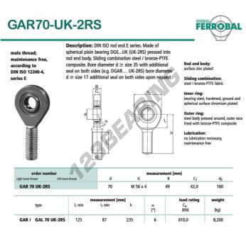 Die Gelenkkopf Sa bekannt als GAR70-UK-2RS-DURBAL DURBAL, hat eine Gewindesteigung von , einen Innendurchmesser von 70 mm, einen Außendurchmesser von 160 mm und eine Dicke von 49 mm.