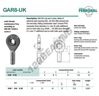 Die Gelenkkopf Sa bekannt als GAR8-UK-DURBAL DURBAL, hat eine Gewindesteigung von , einen Innendurchmesser von 8 mm, einen Außendurchmesser von 24 mm und eine Dicke von 8 mm.