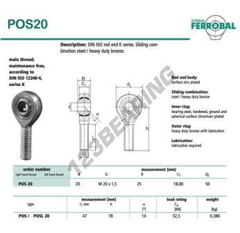 Die Gelenkkopf Sa bekannt als POS20-DURBAL DURBAL, hat eine Gewindesteigung von , einen Innendurchmesser von 20 mm, einen Außendurchmesser von 50 mm und eine Dicke von 25 mm.