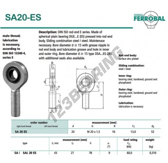 Die Gelenkkopf Sa bekannt als SA20-ES-DURBAL DURBAL, hat eine Gewindesteigung von , einen Innendurchmesser von 20 mm, einen Außendurchmesser von 53 mm und eine Dicke von 16 mm.