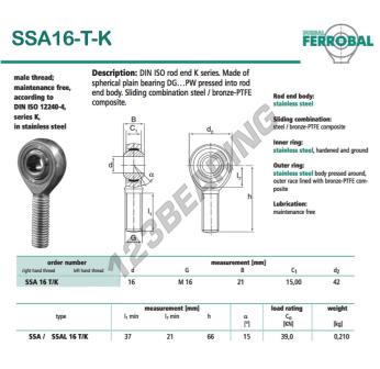 Die Gelenkkopf Sa bekannt als SSA16-T-K-DURBAL DURBAL, hat eine Gewindesteigung von , einen Innendurchmesser von 16 mm, einen Außendurchmesser von 42 mm und eine Dicke von 21 mm.