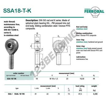 Die Gelenkkopf Sa bekannt als SSA18-T-K-DURBAL DURBAL, hat eine Gewindesteigung von , einen Innendurchmesser von 18 mm, einen Außendurchmesser von 44 mm und eine Dicke von 23 mm.