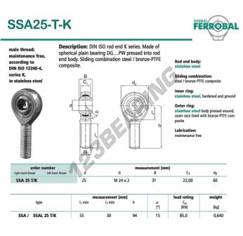 Die Gelenkkopf Sa bekannt als SSA25-T-K-DURBAL DURBAL, hat eine Gewindesteigung von , einen Innendurchmesser von 25 mm, einen Außendurchmesser von 60 mm und eine Dicke von 31 mm.