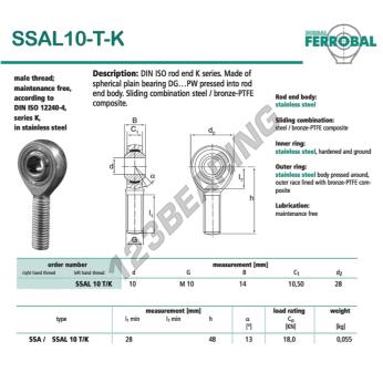Die Gelenkkopf Sa bekannt als SSAL10-T-K-DURBAL DURBAL, hat eine Gewindesteigung von , einen Innendurchmesser von 10 mm, einen Außendurchmesser von 28 mm und eine Dicke von 14 mm.