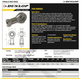Das Gelenkköpfe Si bekannt als FSX-M20-16-C-DUNLOP DUNLOP hat einen Innendurchmesser von 16 mm, einen Außendurchmesser von 50 mm und einer Dicke von 25 mm.