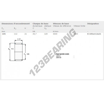Das Nadelkränze , bekannt als K105-112-21-SKF SKF, hat einen Innendurchmesser von 105 mm, einen Außendurchmesser von 112 mm und eine Dicke von 21 mm.
