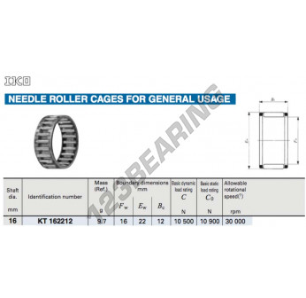Das Nadelkränze , bekannt als KT162212C3-IKO IKO, hat einen Innendurchmesser von 16 mm, einen Außendurchmesser von 22 mm und eine Dicke von 12 mm.