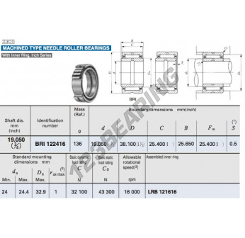 Das Axial-nadellager , bekannt als BRI122416-IKO IKO, hat einen Innendurchmesser von 19.05 mm, einen Außendurchmesser von 38.1 mm und eine Dicke von 25.65 mm.