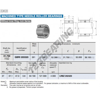 Das Axial-nadellager , bekannt als GBRI203320-IKO IKO, hat einen Innendurchmesser von 31.75 mm, einen Außendurchmesser von 52.388 mm und eine Dicke von 32 mm.
