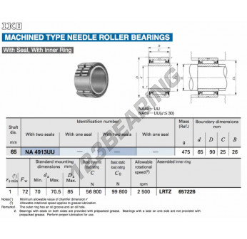 Das Axial-nadellager , bekannt als NA4913-UU-IKO IKO, hat einen Innendurchmesser von 65 mm, einen Außendurchmesser von 90 mm und eine Dicke von 26 mm.