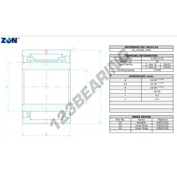 Das Axial-nadellager , bekannt als NKI22-16-ZEN ZEN, hat einen Innendurchmesser von 22 mm, einen Außendurchmesser von 34 mm und eine Dicke von 16 mm.