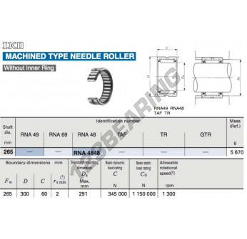 Das Axial-nadellager , bekannt als RNA4848-IKO IKO, hat einen Innendurchmesser von 265 mm, einen Außendurchmesser von 300 mm und eine Dicke von 60 mm.
