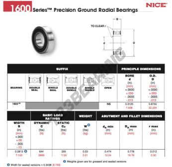 Das Rillenkugellager, bekannt als 1603-NS-NICE NICE, hat einen Innendurchmesser von 7.938 mm, einen Außendurchmesser von 22.225 mm und eine Dicke von 7.15 mm.