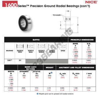 Das Rillenkugellager, bekannt als 1628-DC-NICE NICE, hat einen Innendurchmesser von 15.875 mm, einen Außendurchmesser von 41.275 mm und eine Dicke von 12.7 mm.