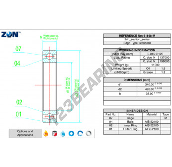 Das Rillenkugellager, bekannt als 61868-M-ZEN ZEN, hat einen Innendurchmesser von 340 mm, einen Außendurchmesser von 420 mm und eine Dicke von 38 mm.