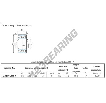 Das Rillenkugellager, bekannt als 7321-CDB-FY-JTEKT JTEKT, hat einen Innendurchmesser von 105 mm, einen Außendurchmesser von 225 mm und eine Dicke von 98 mm.