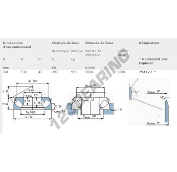 Das Rollenlager, bekannt als 29412-E-SKF SKF, hat einen Innendurchmesser von 60 mm, einen Außendurchmesser von 130 mm und eine Dicke von 42 mm.