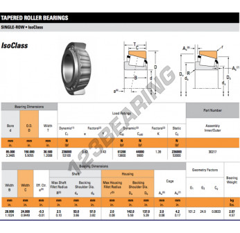 Das Kegelrollenlager, bekannt als 30217-TIMKEN TIMKEN, hat einen Innendurchmesser von 85 mm, einen Außendurchmesser von 150 mm und eine Dicke von 30.5 mm.