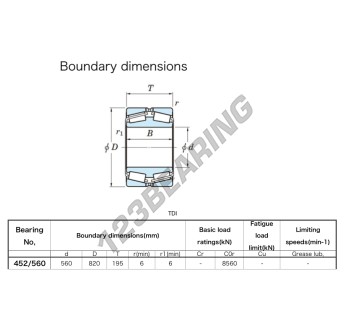 Das Kegelrollenlager, bekannt als 452-560-JTEKT JTEKT, hat einen Innendurchmesser von 560 mm, einen Außendurchmesser von 820 mm und eine Dicke von 195 mm.