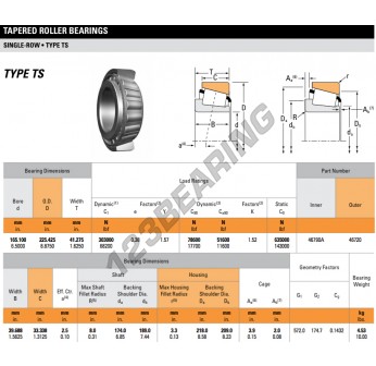 Das Kegelrollenlager, bekannt als 46790A-46720-TIMKEN TIMKEN, hat einen Innendurchmesser von 165.1 mm, einen Außendurchmesser von 225.425 mm und eine Dicke von 41.275 mm.