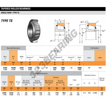 Das Kegelrollenlager, bekannt als 475-472A-TIMKEN TIMKEN, hat einen Innendurchmesser von 55 mm, einen Außendurchmesser von 120 mm und eine Dicke von 29 mm.