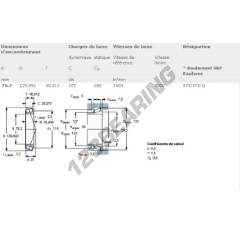 Das Kegelrollenlager, bekannt als 575-572-Q-SKF SKF, hat einen Innendurchmesser von 76.2 mm, einen Außendurchmesser von 139.99 mm und eine Dicke von 36.51 mm.