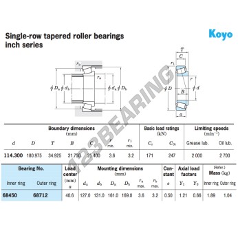 Das Kegelrollenlager, bekannt als 68450-68712-JTEKT JTEKT, hat einen Innendurchmesser von 114.3 mm, einen Außendurchmesser von 180.975 mm und eine Dicke von 34.925 mm.