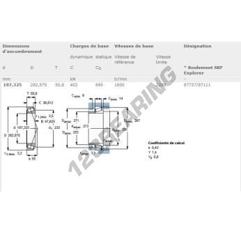 Das Kegelrollenlager, bekannt als 87737-87111-SKF SKF, hat einen Innendurchmesser von 187.33 mm, einen Außendurchmesser von 282.58 mm und eine Dicke von 50.8 mm.