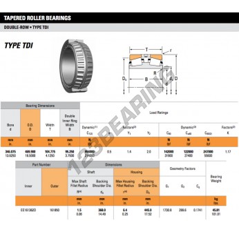 Das Kegelrollenlager, bekannt als EE161362D-161850-TIMKEN TIMKEN, hat einen Innendurchmesser von 346.075 mm, einen Außendurchmesser von 469.9 mm und eine Dicke von 104.775 mm.