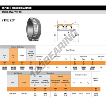 Das Kegelrollenlager, bekannt als LM377449D-LM377410-TIMKEN TIMKEN, hat einen Innendurchmesser von 558.673 mm, einen Außendurchmesser von 736.6 mm und eine Dicke von 196.85 mm.