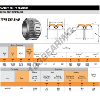Das Kegelrollenlager, bekannt als NA456SW-452D-TIMKEN TIMKEN, hat einen Innendurchmesser von 50.8 mm, einen Außendurchmesser von 107.95 mm und eine Dicke von 74.615 mm.