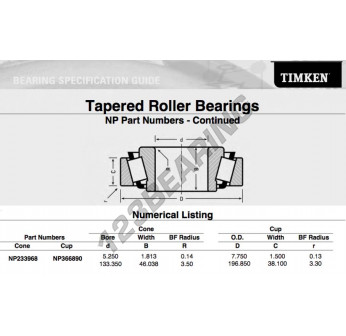 Das Kegelrollenlager, bekannt als NP233968-NP366890-TIMKEN TIMKEN, hat einen Innendurchmesser von 133.35 mm, einen Außendurchmesser von 196.85 mm und eine Dicke von 46.038 mm.