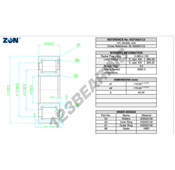 Das Rollenlager, bekannt als NCF3022-V-C3-ZEN ZEN, hat einen Innendurchmesser von 110 mm, einen Außendurchmesser von 170 mm und eine Dicke von 45 mm.