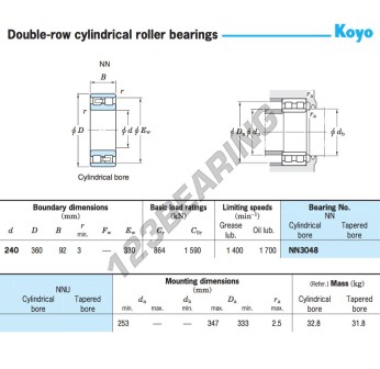 Das Rollenlager, bekannt als NN3048-JTEKT JTEKT, hat einen Innendurchmesser von 240 mm, einen Außendurchmesser von 360 mm und eine Dicke von 92 mm.