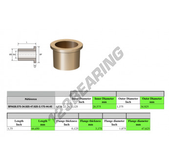 Das Bronze Gleitlager Mit Bund bekannt als BFAI28.575-34.925-47.625-3.175-44.45 Generisches, hat einen Innendurchmesser von 28.575 mm, einen Außendurchmesser von 34.925 mm und eine Länge von 44.45 mm. Sie wird aus hergestellt.