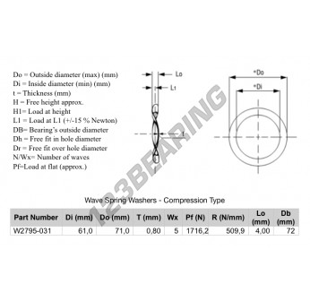 Das Gewellte Druckfederscheiben mit der Referenz W2795031 hat einen Innendurchmesser von 61 mm, einen Außendurchmesser von 71 mm und eine Dicke von 0.8 mm. Er ist aus dem Material STAHL gefertigt.