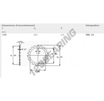 Das Sicherung bekannt als MBL38-SKF SKF hat einen Innendurchmesser von 190 mm, einen Außendurchmesser von 232 mm und eine Dicke von 2.5 mm.